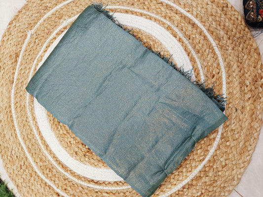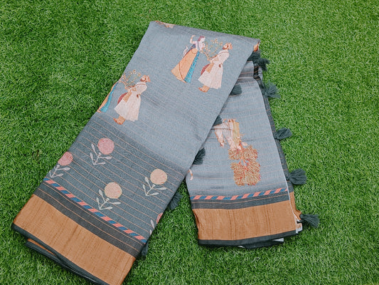 Blue Gray and Pink Leaf Designer Semi Kanchi Silk Saree