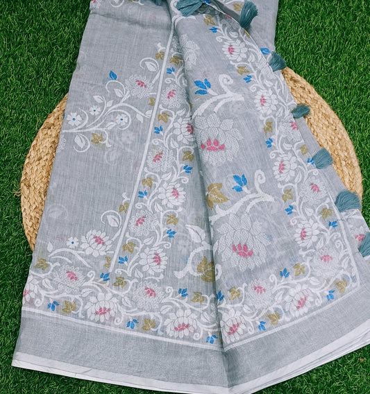 Gray and Pink Floral Designer Semi Kanchi Silk Saree